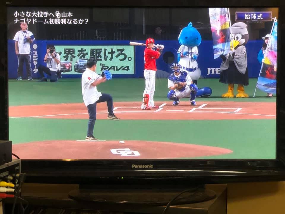 ※始球式は、柴橋正直市長が4884(しばはし)の背番号でマウンドへ(写真⑦=CBCテレビより)。この魔球は、イチロー選手でも打てないでしょう…。