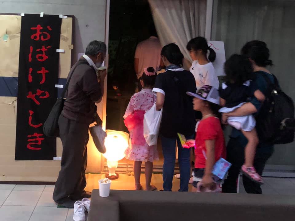 バスを見送った後、夜の肝試しに合流。暗闇の中、持ち場のトイレの陰に隠れ、お化け屋敷の効果音(ユーチューブを街頭演説用スピーカーで拡大)を流し、妖怪のお面の顔に懐中電灯の光を当てて飛び出します。それよりも、女性陣のお化けのレベル(=写真)の高さには驚嘆でした。