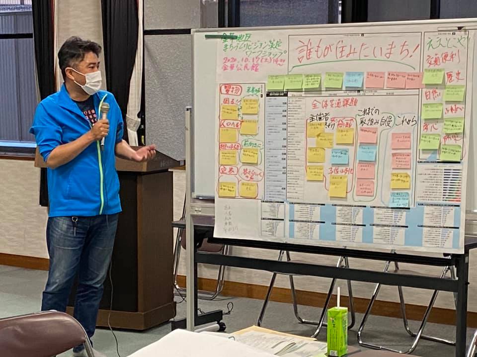 金華まちづくり協議会が、金華地区全世帯(自治会加入)を対象に行ったアンケート集計結果(回答771件)を受けて、地域の目指すべき将来像を整理するワークショップが、公民館で開催されました。