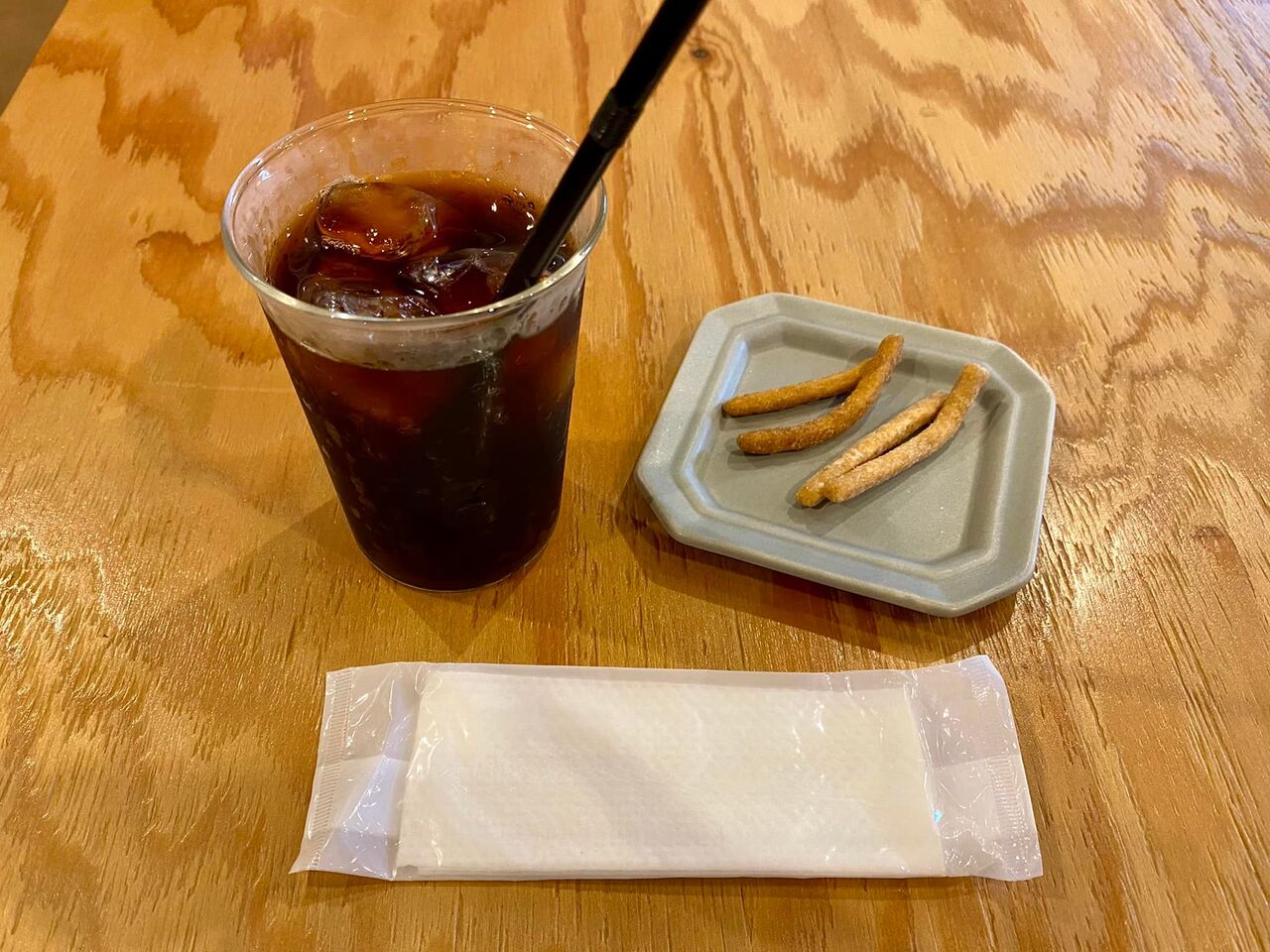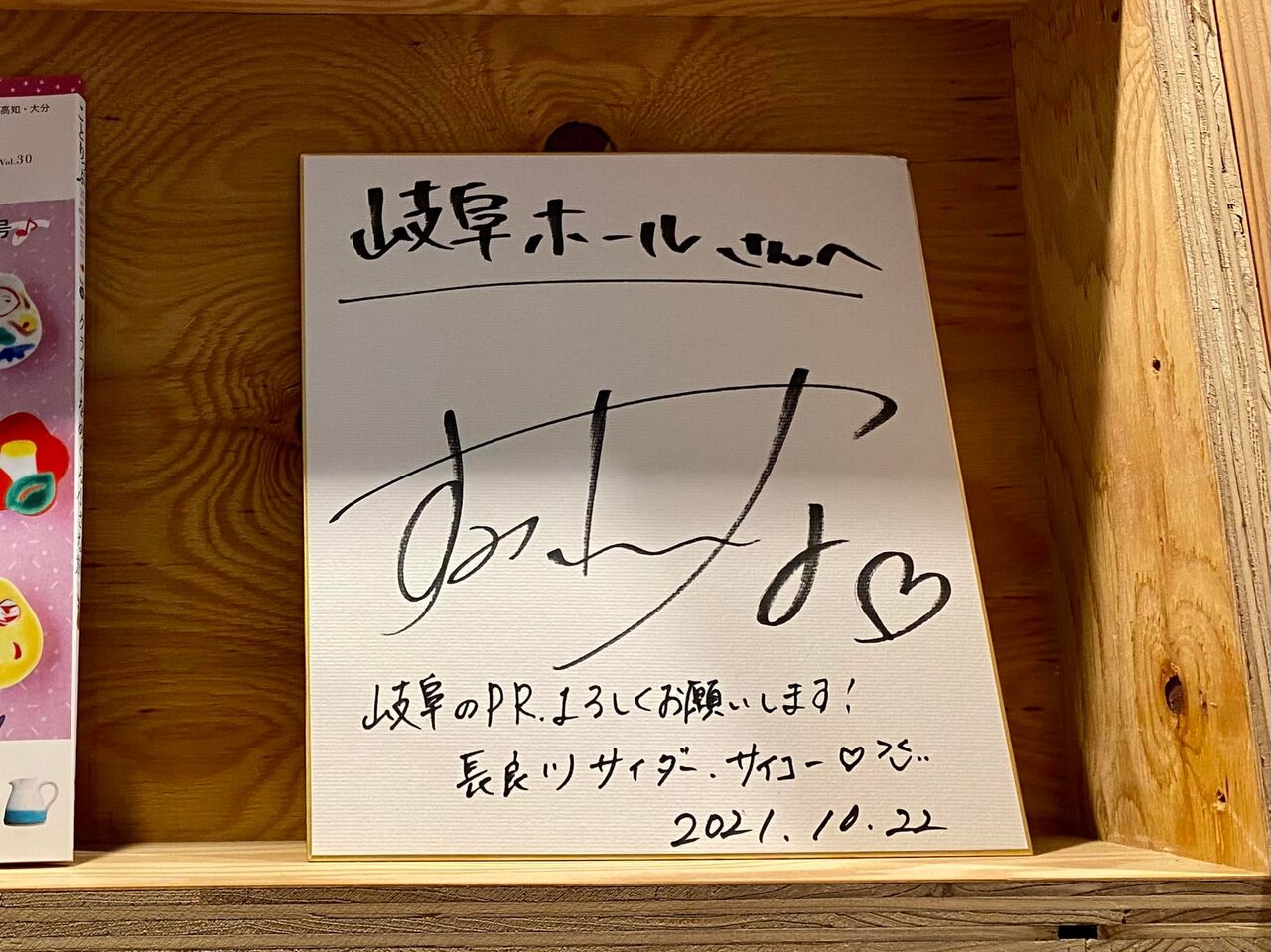 店内には、岐阜の各種チラシが置いてあり、棚には岐阜のいいもの=雑貨・工芸品やこだわり食材等が所狭しと並んでいます。アイスコーヒーを注文すると「大地のかりんとう」( 山本佐太郎商店)が付いてきました。岐阜市出身のアナウンサー鷲見玲奈さんのサイン色紙があり、長良川サイダー・サイコー♡の文字が…。