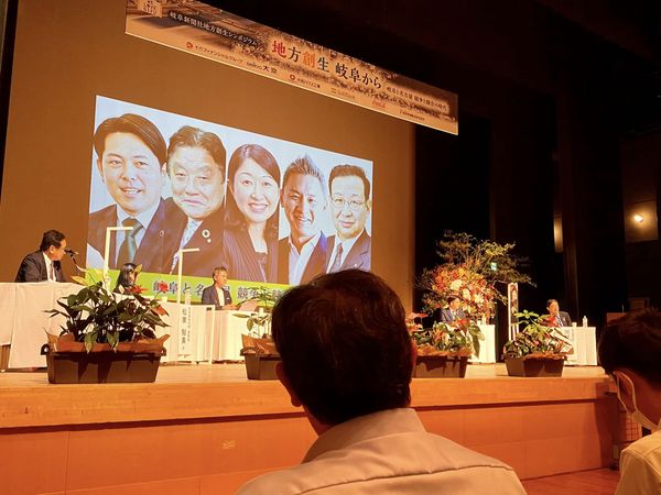 パネルディスカッション「“地方創生 岐阜から” 岐阜と名古屋 競争と競合の時代」。パネリストは、河村たかし氏(名古屋市長)、柴橋正直氏(岐阜市長)、松家鮎美氏(岐阜薬科大学准教授)、秋元祥治氏(NPO法人G-net創業者)。コーディネーターは、矢島薫氏(岐阜新聞社社長)。未来の都市づくりや、両市の連携などについて意見が交わされました。