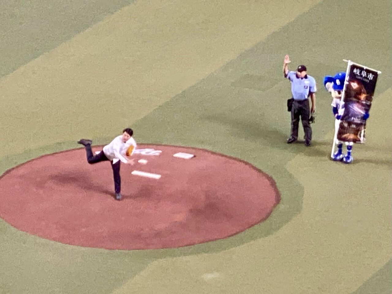 始球式は、柴橋市長。ストライクゾーンを外れましたが、勢いのあるボールでした。