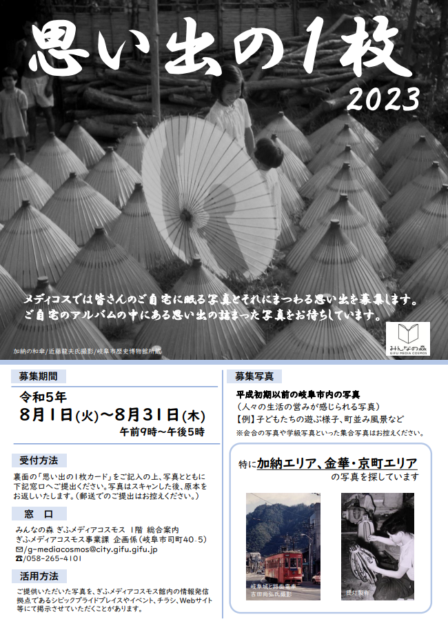 ぎふメディアコスモスでは、『思い出の1枚』《自宅に眠る平成初期以前の古い写真》を募集中。特に金華・京町エリア、加納エリアの写真を探しているとのこと。