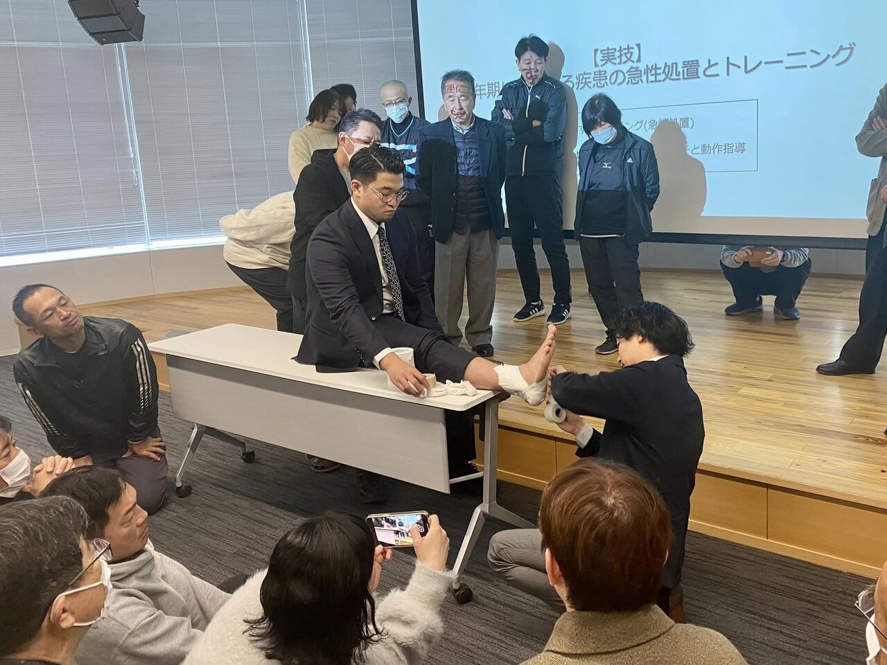 急性処置の実技では、隣の席のサッカー部長と互いの足首にテーピングを行いました。