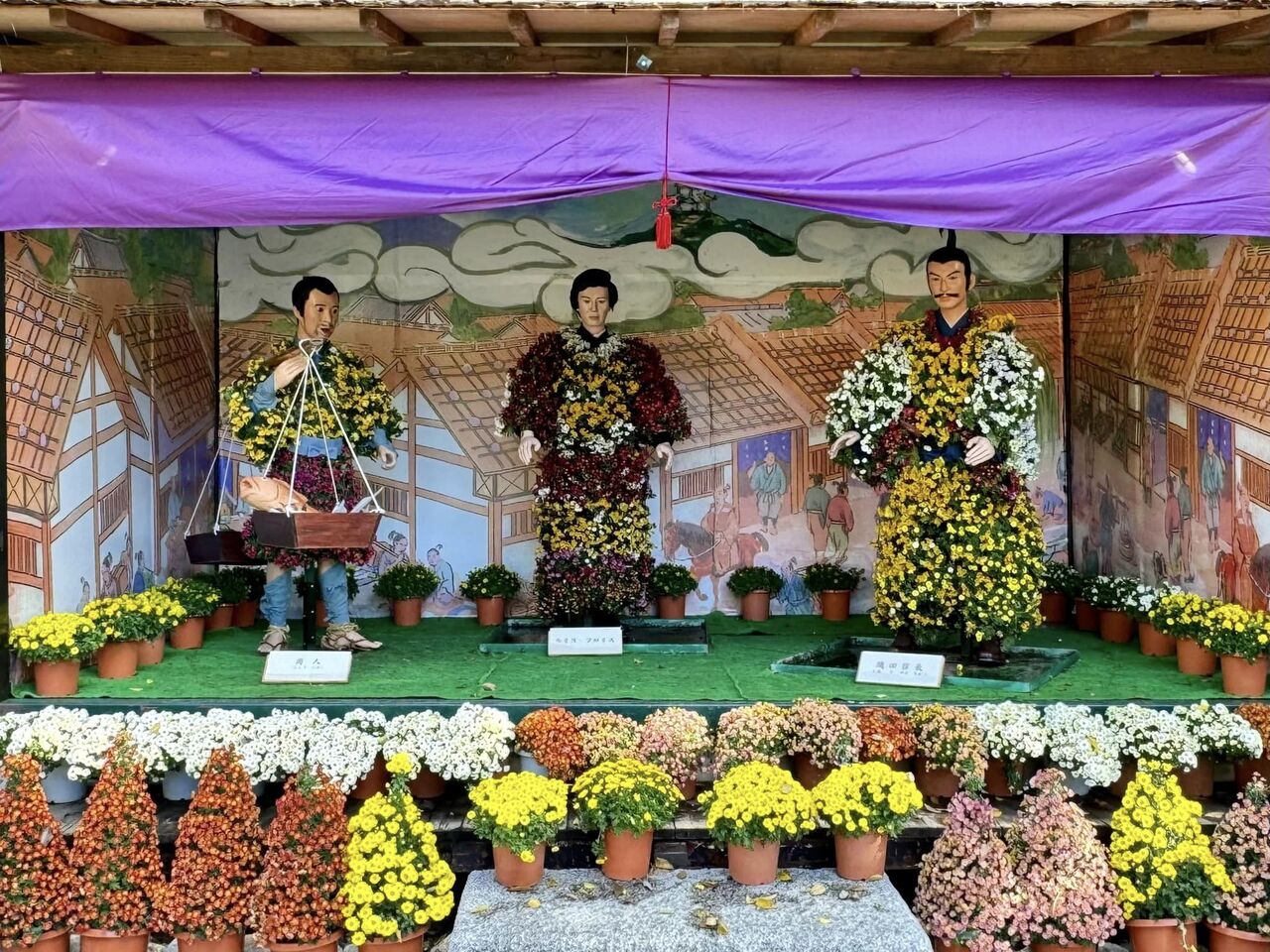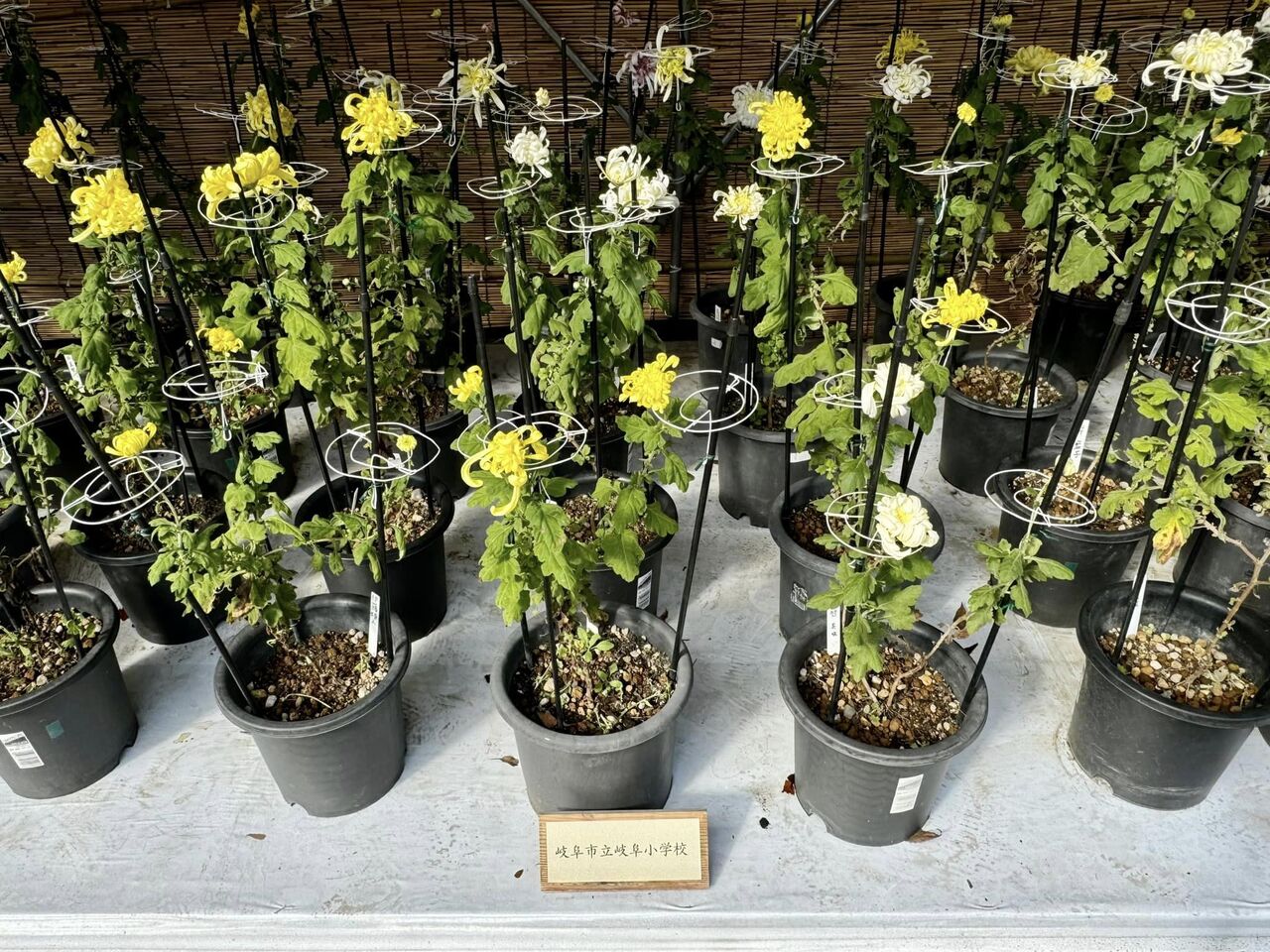 地元・岐阜小学校の児童達の作品も出展。故吉田好成先輩のアドバイスで私が仲介して10数年になりますが、難しいと言われる菊作りを、金華ふれあいクラブ(老人クラブ)連合会の皆さんの協力を得ながら、今年も頑張って育ててくれました。