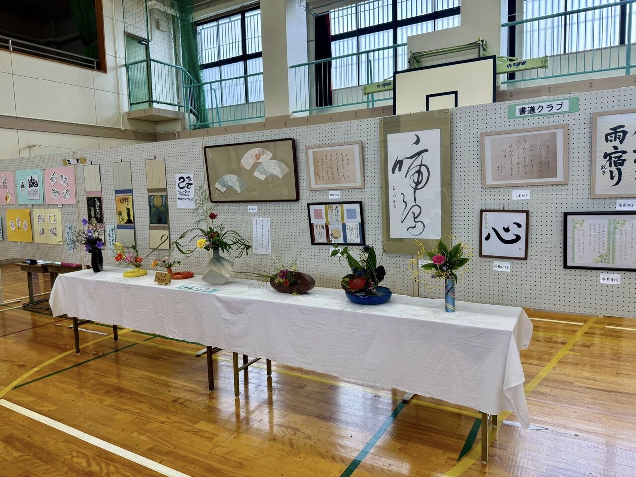 展示発表は、絵画・手芸・ペーパークラフト・俳句・生け花・書道・己書・写真…多岐にわたり素晴らしい作品ばかり。岐阜小学校全児童と岐阜中央中学校美術部、明照幼稚園の作品も並びます。