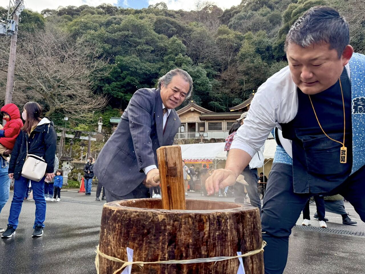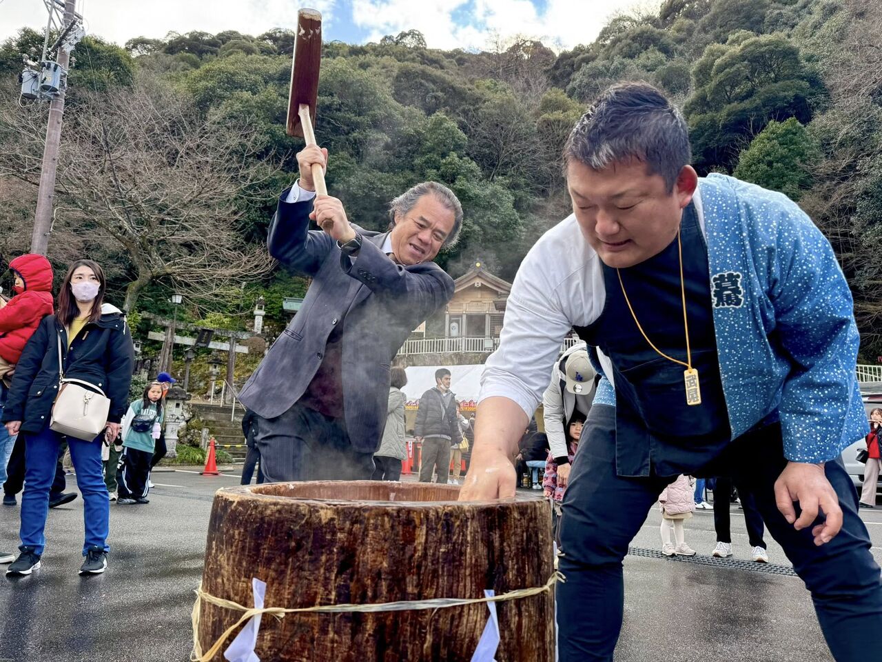 神輿愛好会“驀(まっしぐら)”の「新年縁起餅つき」にお邪魔しました。伊奈波神社(中段駐車場)で、毎年1月3日に開催されています。