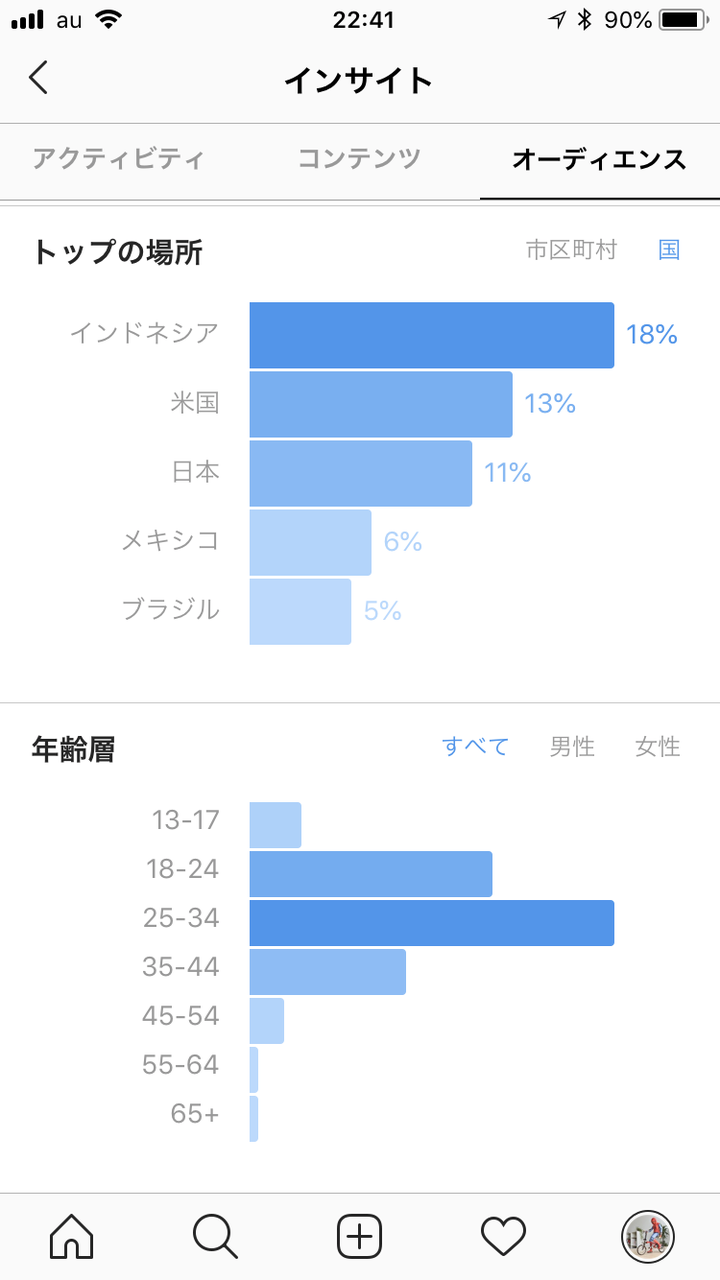 インスタの世界は基本写真での「ビジュアルコミュニケーション」になるので、言語の壁はないので、世界のオモ写ファンとつながることができます。ちなみにこちらが僕のインスタフォロワーさんのインサイトになります。