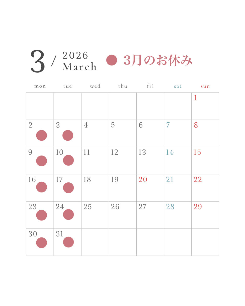 3月のお休み:<月・火>