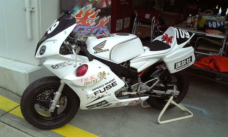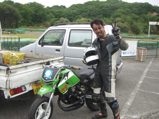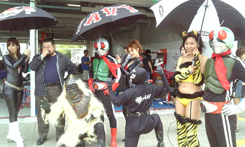 とりあえず無事に完走してきました。出発の前日ベンチの上でテスト中にエンジンブロー・・・次の日に組み上げての出発でした。練習、予選と大きなトラブル無くいざ決勝へ!決勝はラスト1時間あたりで2コーナーでキャブレーターが外れてた為ショートカットしてピットに戻り修復!とりあえず無事完走できました。なかなか大変なプロジェクトでした。同チームのNSF白バイ仕様の車両です。仮面ライダー、ショッカー、ラムちゃん??、ボンテージギャル??も応援に来てくれました。