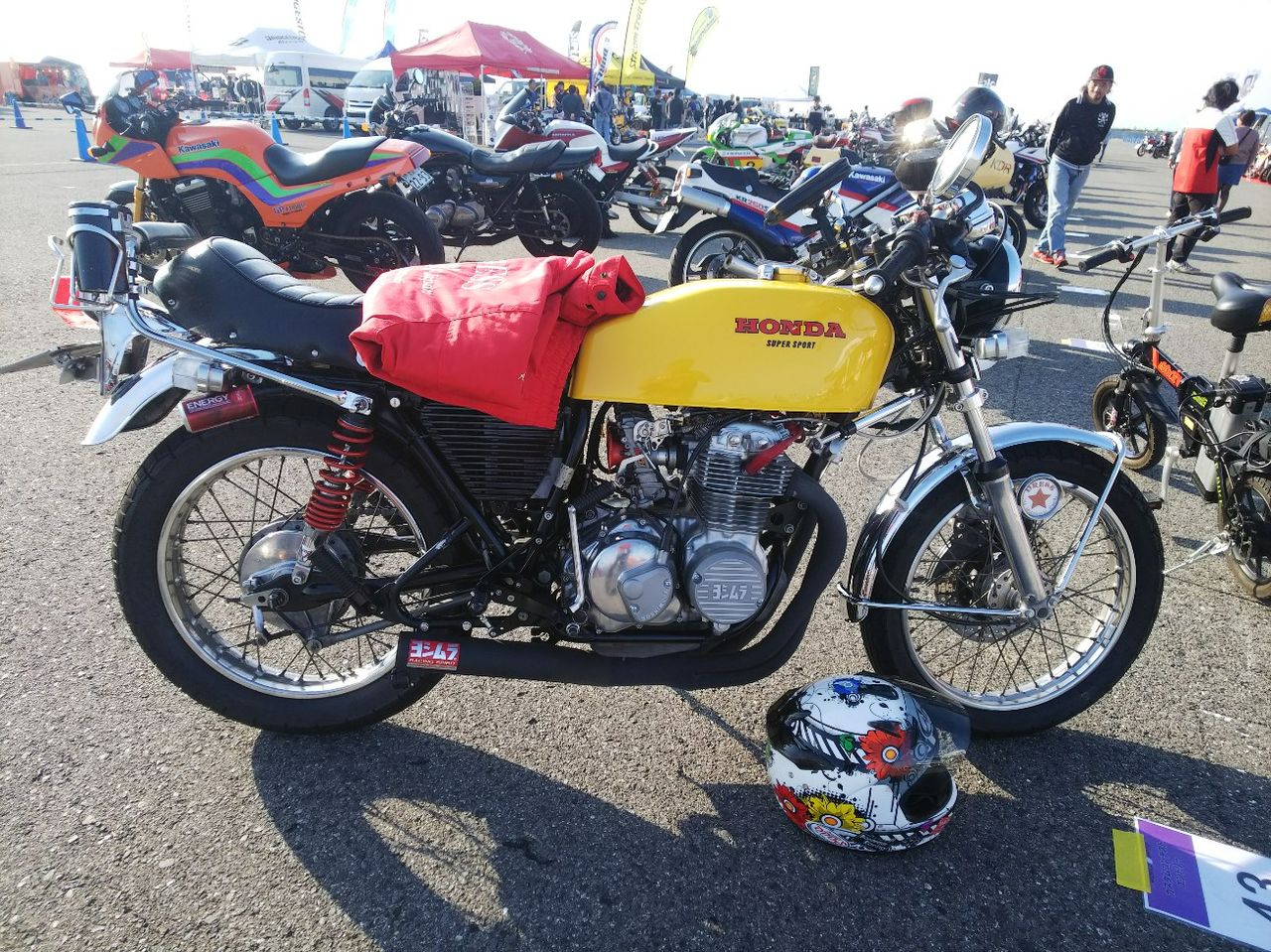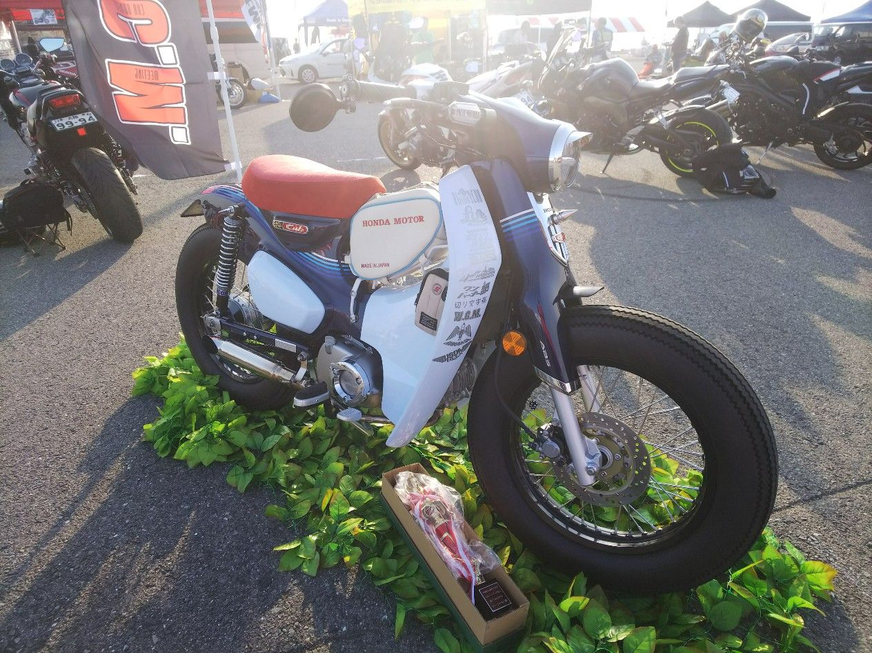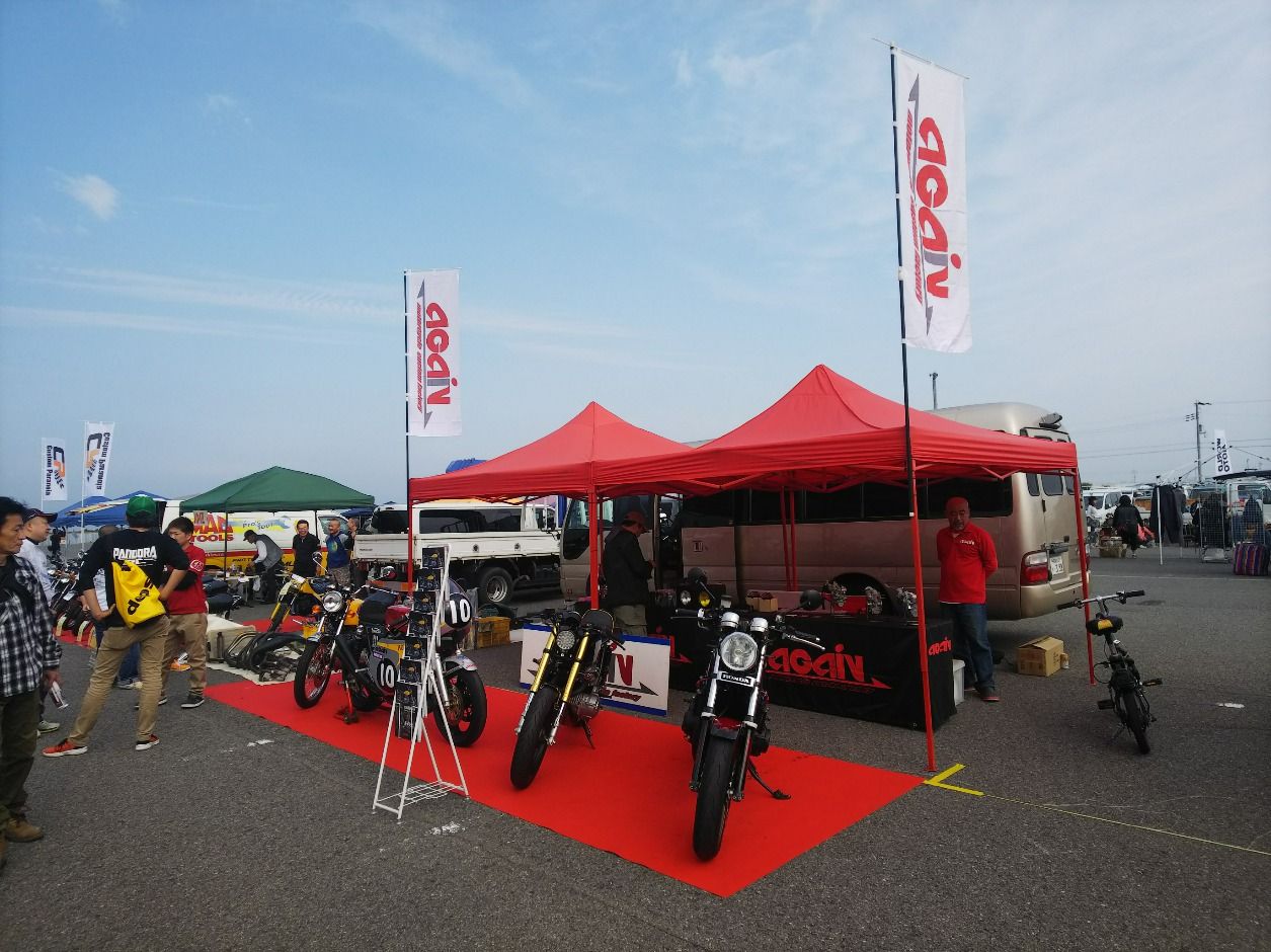 設営完了してからカスタムバイクコンテストの車両を見て回っていました。最近、沢山のパーツを購入して頂いた愛知県のお客様です。このCB、お話を聞くと当社のユーザーさんが乗っていた車両が回り回って現オーナーさんの所に来たみたいです。こちらの車両は上記のお友達です。個人的に気になったのはKR500レプリカ中身はガンマですがこちらはコンテストで優勝したC125です。