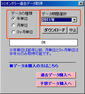 [ファイル]→[ミリオンダラーデータダウンロード]→[過去データ]の画面を開き、希望の過去データを選択した後、「ダウンロード」をクリックする。