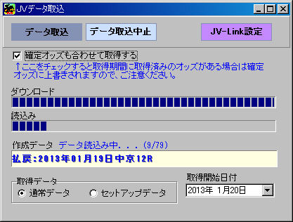 確定オッズを取得する場合は、「確定オッズも合わせて取得する」をチェックしておく。