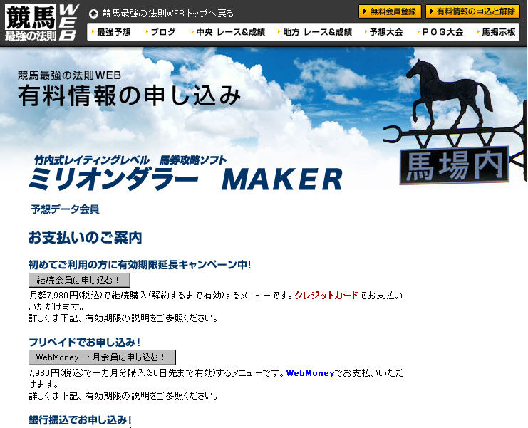 「競馬最強の法則WEB」にご自身のIDとパスワードでログインし、「ミリオンダラー MAKER 予想データサービス」のページで、予想データ会員の料金決済を行います。