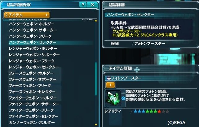 前も紹介しましたが1クラスにつき4種類の称号があり、4つ目のセレクターの報酬がフォトンブースター1個なので8クラスコンプリートすれば8個もらえます。