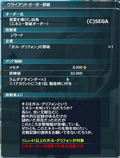 また、ジラードにもガル・グリフォンを撃破するという新しいオーダーが追加されていて報酬はラムダグラインダー3個ですが、1アカウントにつき1回つまり最初の1回しかもらえないので注意。