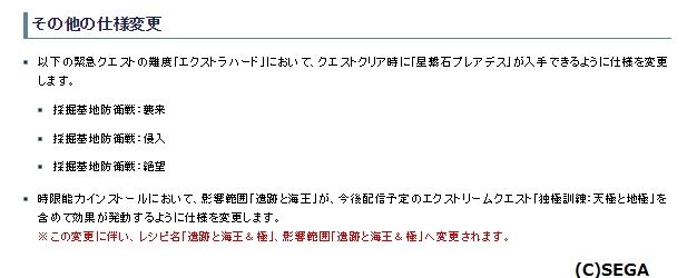 時限能力インストールにおいて、影響範囲「遺跡と海王」が、今後配信予定のエクストリームクエスト「独極訓練:天極と地極」を含めて効果が発動するように仕様を変更します。というものでした。