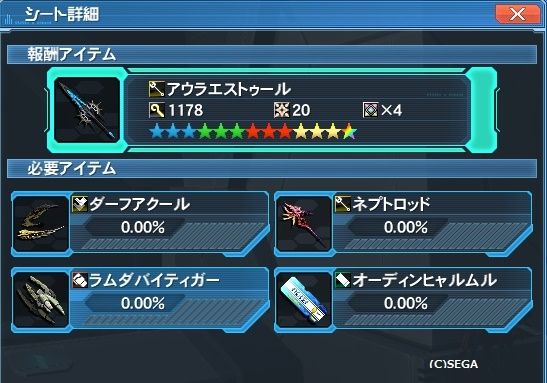 8種類のシートがありますが、どれも左上は漆黒の騎士で出てくるXHのボス、右下がオーディンレベル1、そして右上と左下は海底と浮上施設で出てくるエネミーが対象となっています。右下はレアブーストして漆黒の騎士に行けばすぐに埋まりますが、左上のボスはランダムで出現な上にアンゲルだとブースト330%で9.89%(元の値は2.3%)、ディアボだとブースト280%で21.85%(元の値は5.75%)だったので運が悪いと結構かかります。