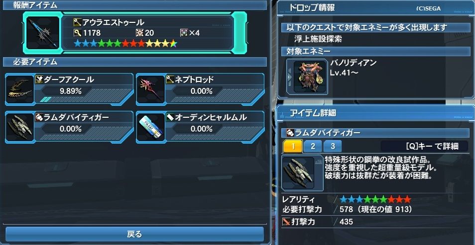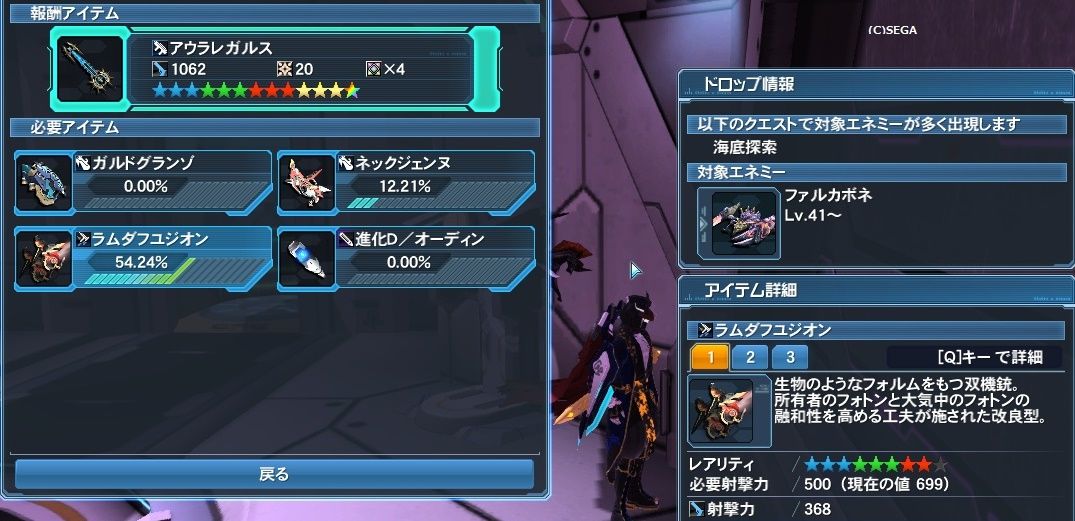 そして右上と左下ですが最初に紹介したような事になってますし、漆黒の騎士に行っても出てこないエネミーだと思うので、素直に他のクエストで対象エネミーを倒すしかありません。ネプト・キャサドーラやレオマドゥラードなどは大海や自由探索やアークスクエスト(ついでにパラレル)ぐらいですが、ビオル・メデューナの場合はエクストリームもあります。