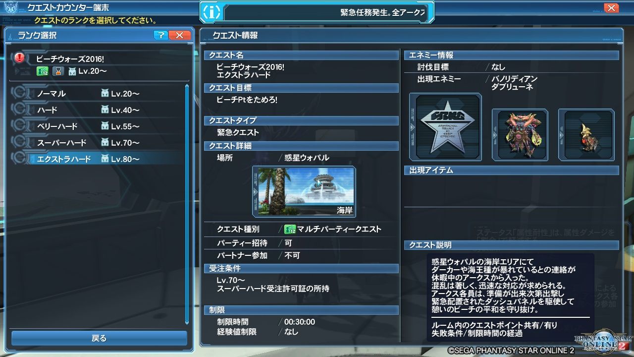 これまた何時も通りクエストポイント共有でポイントが溜まるごとに良いEトラの起こる確率が上がっていき、600ポイントになると水着NPCとの共闘Eトラ、700ポイントになるとニャウからのガルグリと特殊な二つ名のクローム・ドラゴン確定だと思われます。