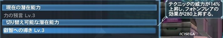モタブの預言書に追加された潜在で効果は(潜在3の場合テクニックの威力が14%上昇し、フォトンフレアの効果が280上昇する。)
