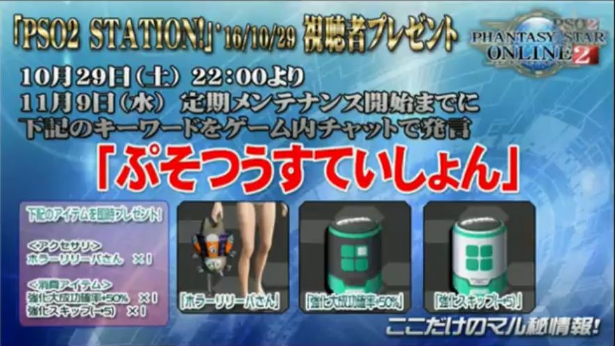 ゲーム内キーワードは「ぷそつうすていしょん」です。