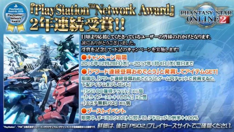 PlayStation Network Awardを2年連続受賞したので12月28日~2017年1月4日までに「アワード連続受賞おめでとう」と発言すると色々アイテムが貰えます。