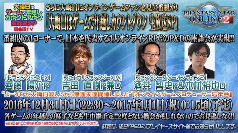 大晦日にカウントダウン生放送が放送される予定で、その中に3大オンラインRPGのP&Dの座談会があるそうです。