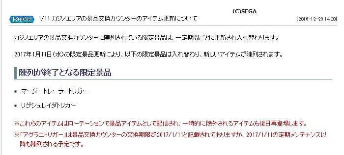 今回は結構色々ありました。1月11日からはARKS NEW YEAR CARNIVAL2017で色々追加されるのでアップデートページをチェックしておきましょう。