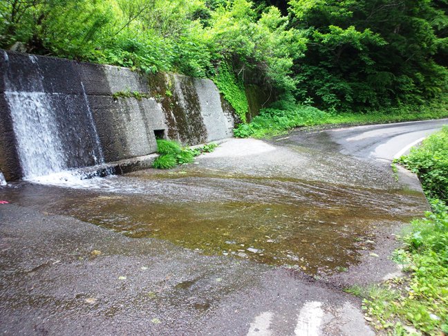 通常、道と川(谷)が交わる場所では、橋を架けて谷を跨ぐのですが、この道では道路を窪ませてそこに谷川の水を流しているのです。