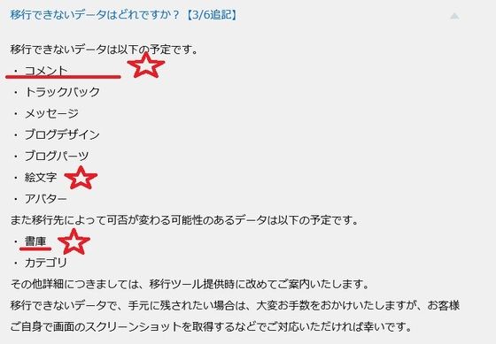 おまけに、私もそうなんですが、書庫をたくさん作って記事を分類分けしてるのに、書庫が移行できなかったら、これもつらいっすよね!!