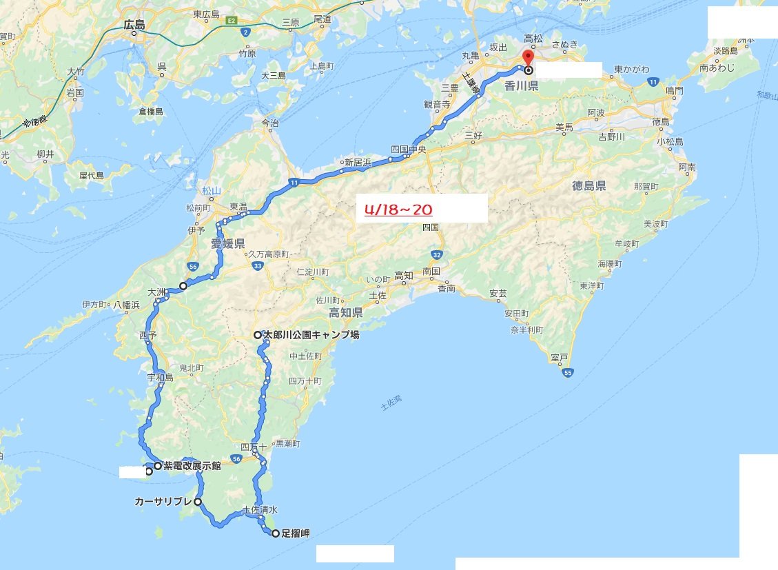 うどん県高松市~高知県安居渓谷~高知県仁淀川町~四国カスルト~高知県梼原町~四万十川沿い~足摺岬~高知県大月町~愛媛県愛南町~愛媛県内子町~うどん県高松市