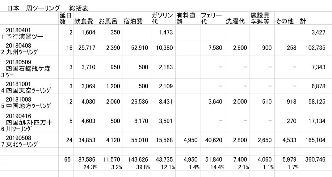 今回の東北ツーリングを終え、全延べ日数65日。 360,746円。