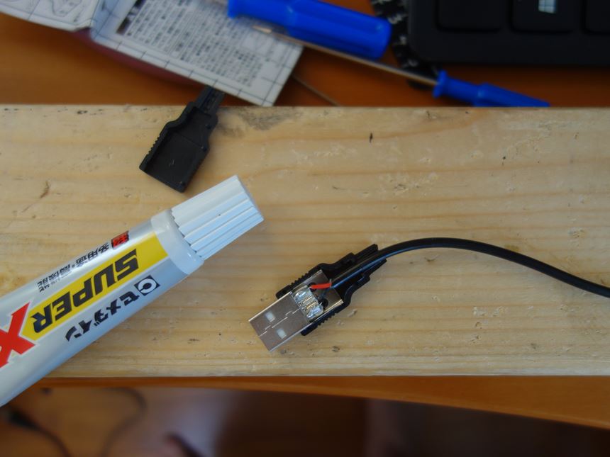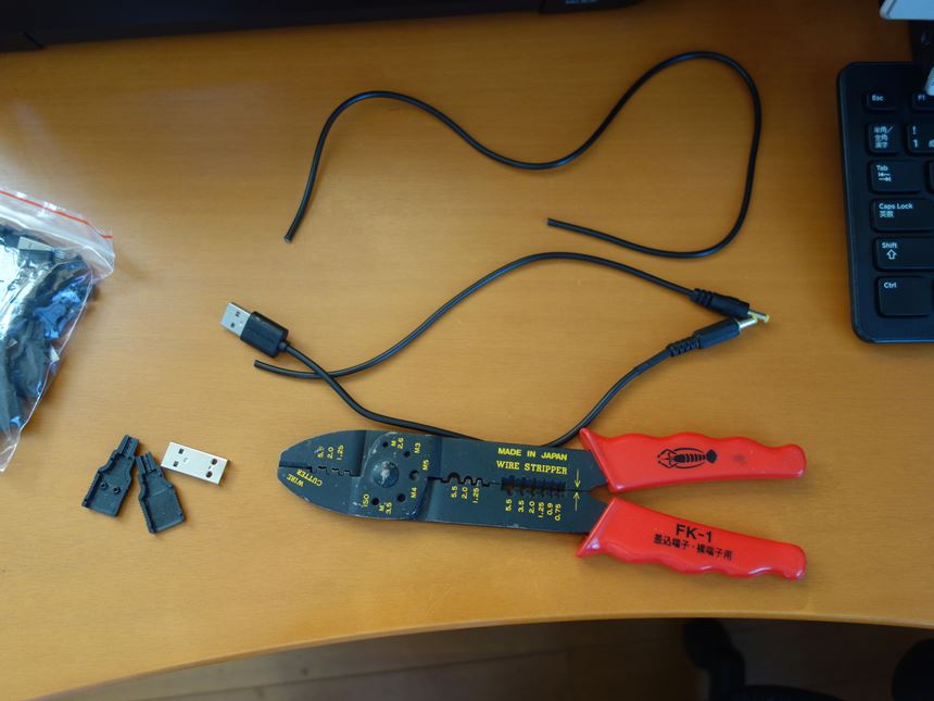 この時は、1本の長いUSB/DC充電ケーブルをぶった切って、USB側のケーブルを利用して、これまたアマゾンでポチした台湾製のDCアダプタを接続したんやけど・・・。