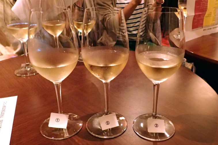 テスト後のワイン会で、講師の先生が「これを飲んで予想してみてください」と用意してくれた3種の白ワイン。わからなさすぎて笑えてくる。(^^;