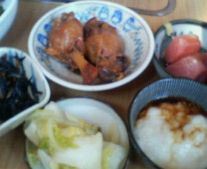 マグロの刺身、とろろ芋、鶏手羽元煮込み、ひじきの煮付け、冷や奴、漬け物が付いたんです