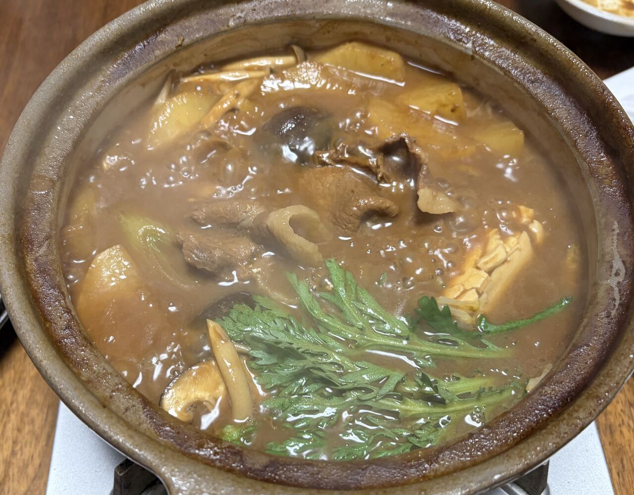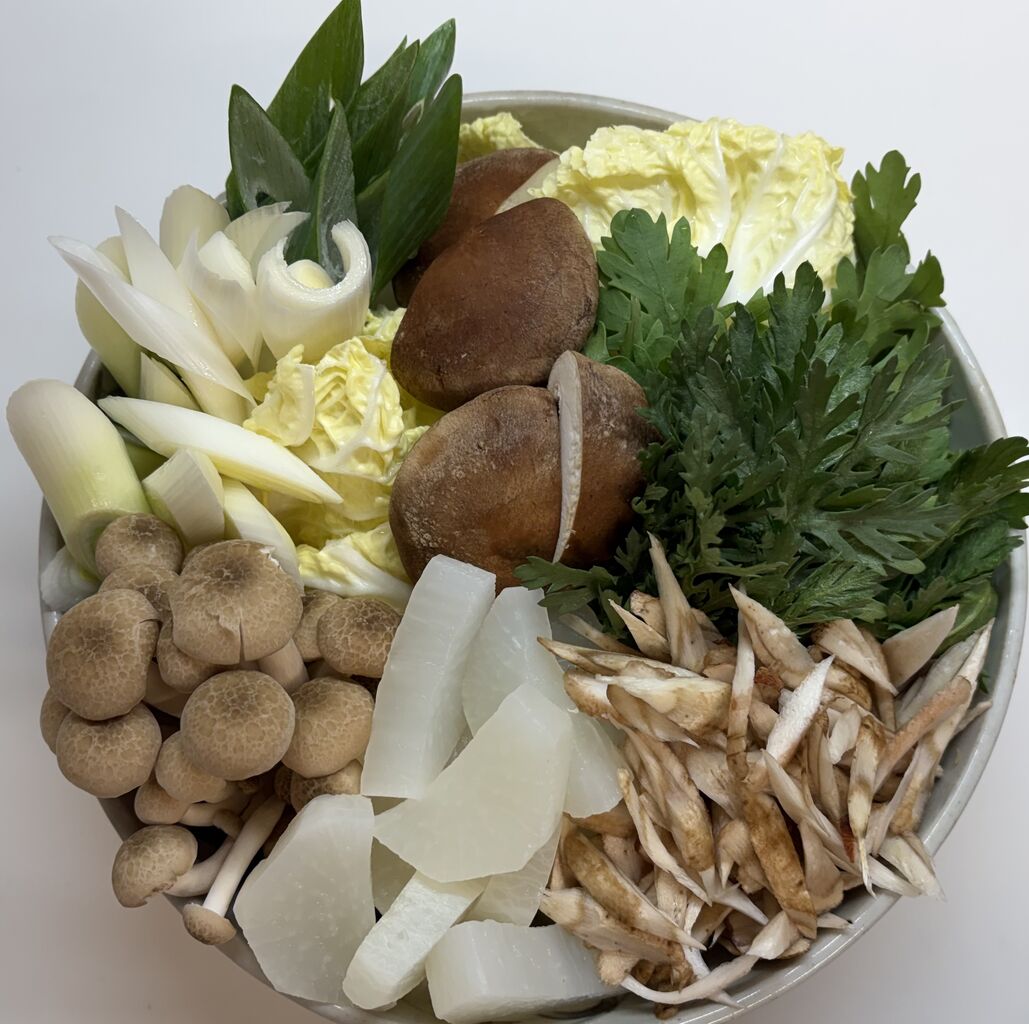 茹で大根、しめじ、長ネギ、白菜、椎茸、菊菜、ごぼう