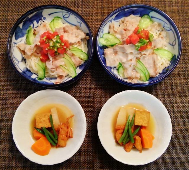 たれがうまうま豚しゃぶ素麺・一口絹揚げと大根の炊いたの(一口絹揚げ・大根・牛蒡のちぎり練り天ぷら・人参・隠元)