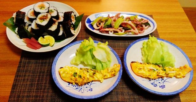 サーモンのタルタル焼き・巻き寿司(牛肉時雨煮・明太葱)・いかと青梗菜の塩麹炒め)