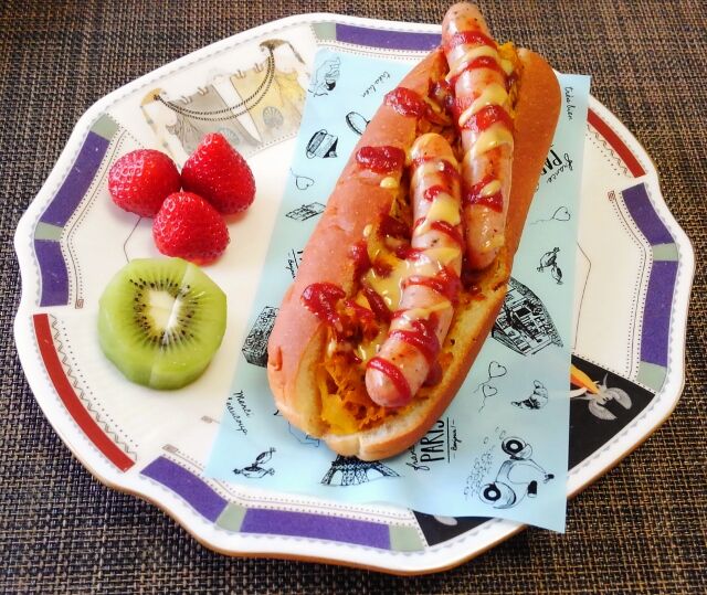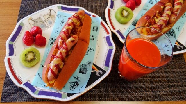 キャベツサブジたっぷりの関西風ホットドック・フルーツ・野菜ジュース