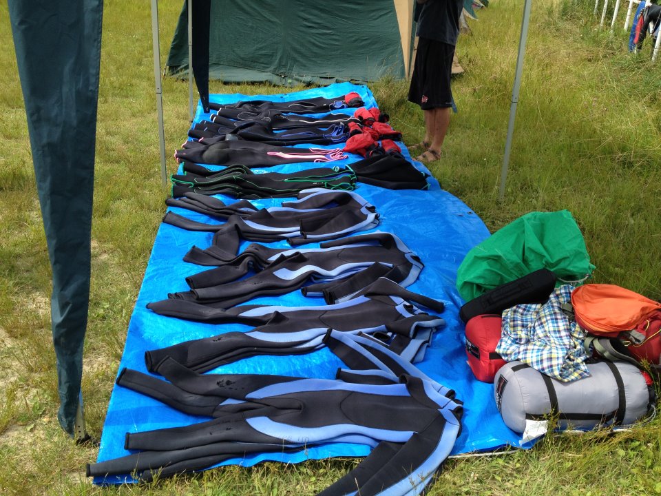 一人一人にウェットスーツを渡してキャンプ用のテントで着替えていただきました。