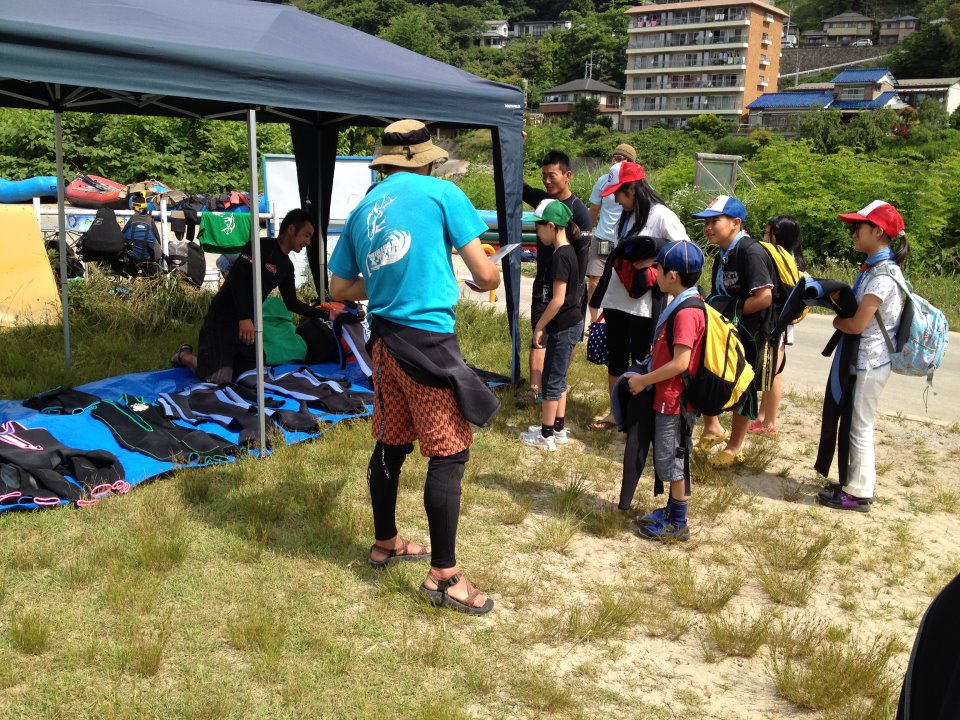 初めてのウェットスーツに苦戦している子供達、この後の楽しい川下りのために頑張って着てました!