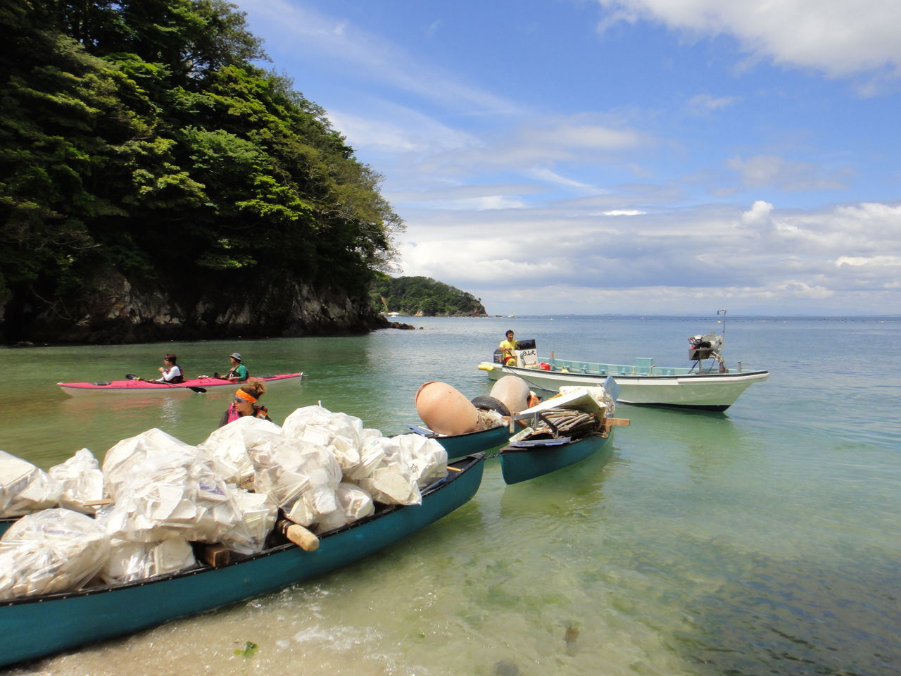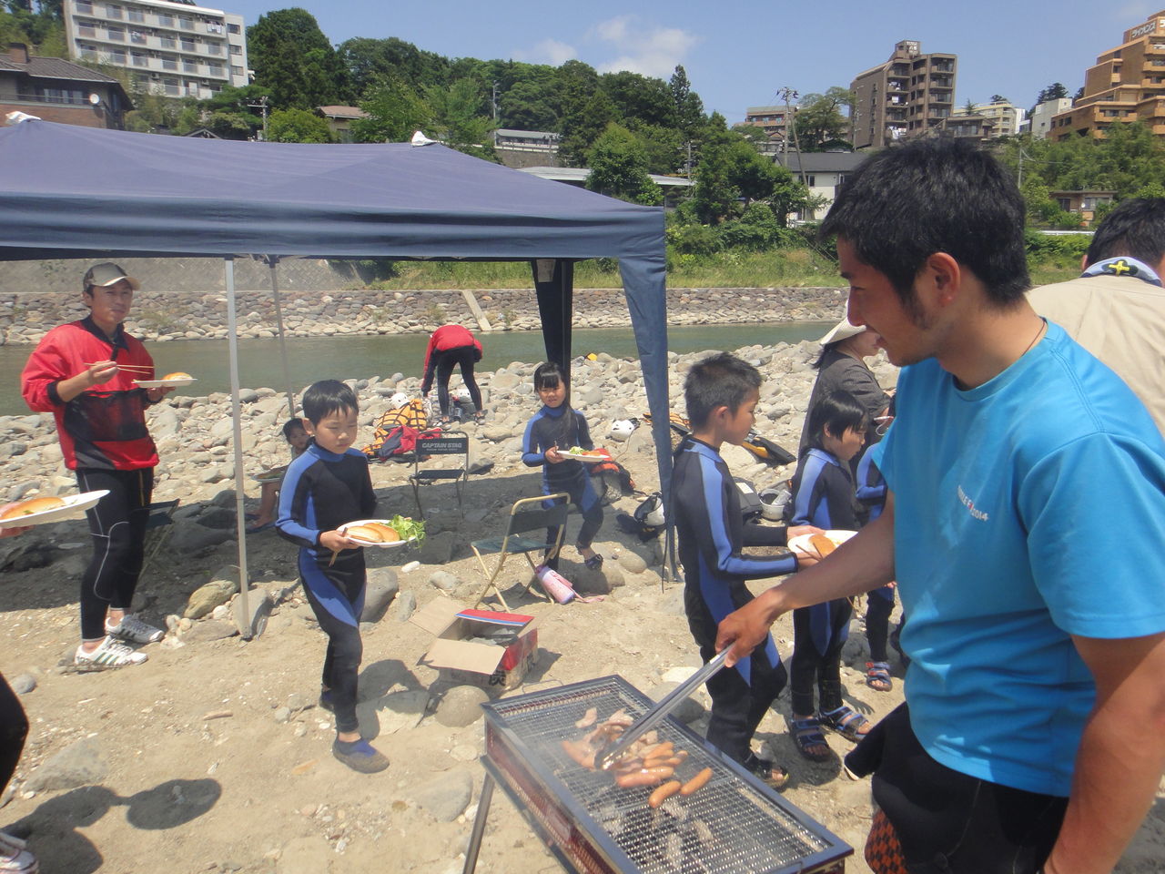 その間、ほかのメンバーはテントの設営、ウェットスーツなどの装備の準備をして子供たちを待ちました。