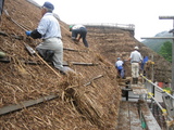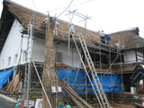 工事の途中に職人さんの写真を撮らせて頂きました。みなさんお若くてお元気です!旧伊南村の茅屋根職人さんとのことです。昔は最低5年の修行。雪の期間は、会津の茅葺き職人(会津茅手)として、茨城などで仕事をされていたそうです。他の屋根職人さんに負けないような最高の茅屋根を葺くことに情熱を傾けていたそうです。今でも、茨城県つくば、八郷、七会などの茅屋根の多くに、会津茅手の技が残されています。