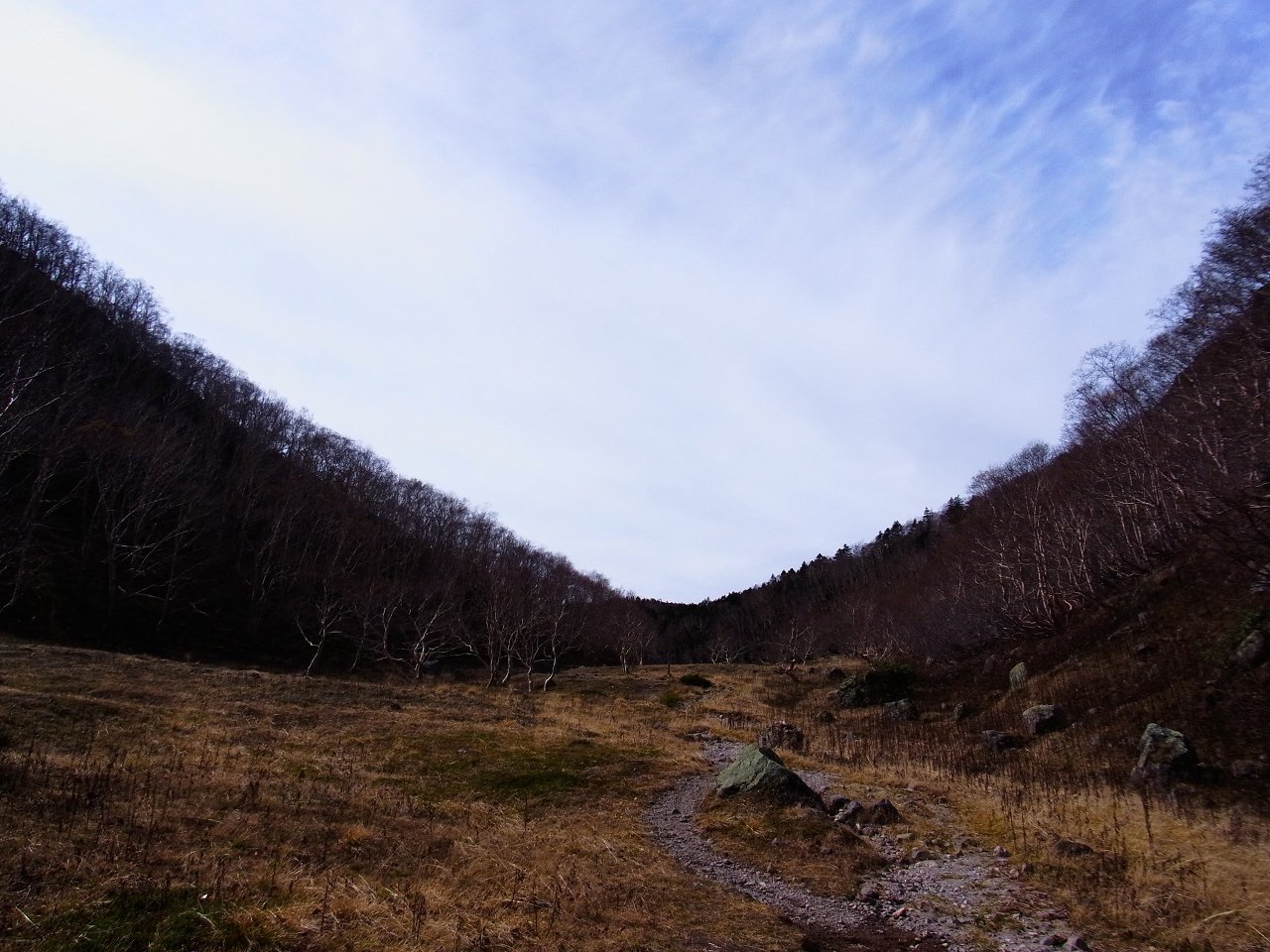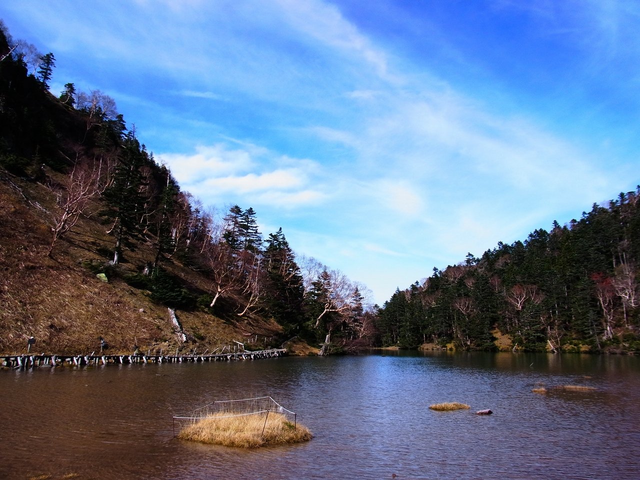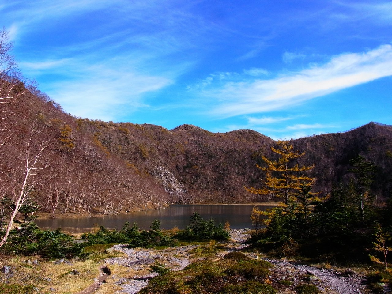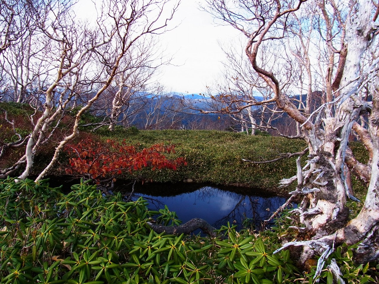 弥陀ヶ池(みだがいけ)まで下りてきました。台風の影響はどうなのかわかりませんが、きれいな水を湛えており安堵し嬉しくなりました。この先から五色山へ戻れますが、せっかくなので五色沼も見に行きましょう。勿論紅葉はとっくに終わりで木々の葉は落ちていますが、これはこれで趣がありいいですね。では納得できたので尾根へ這い上がり五色山へ向かいましょう。
