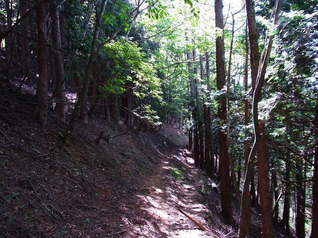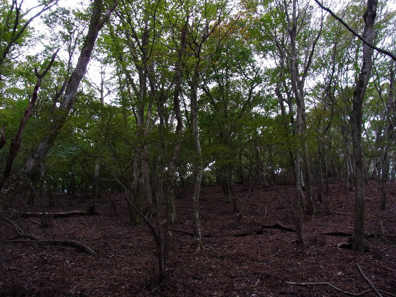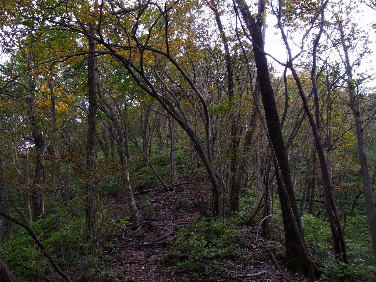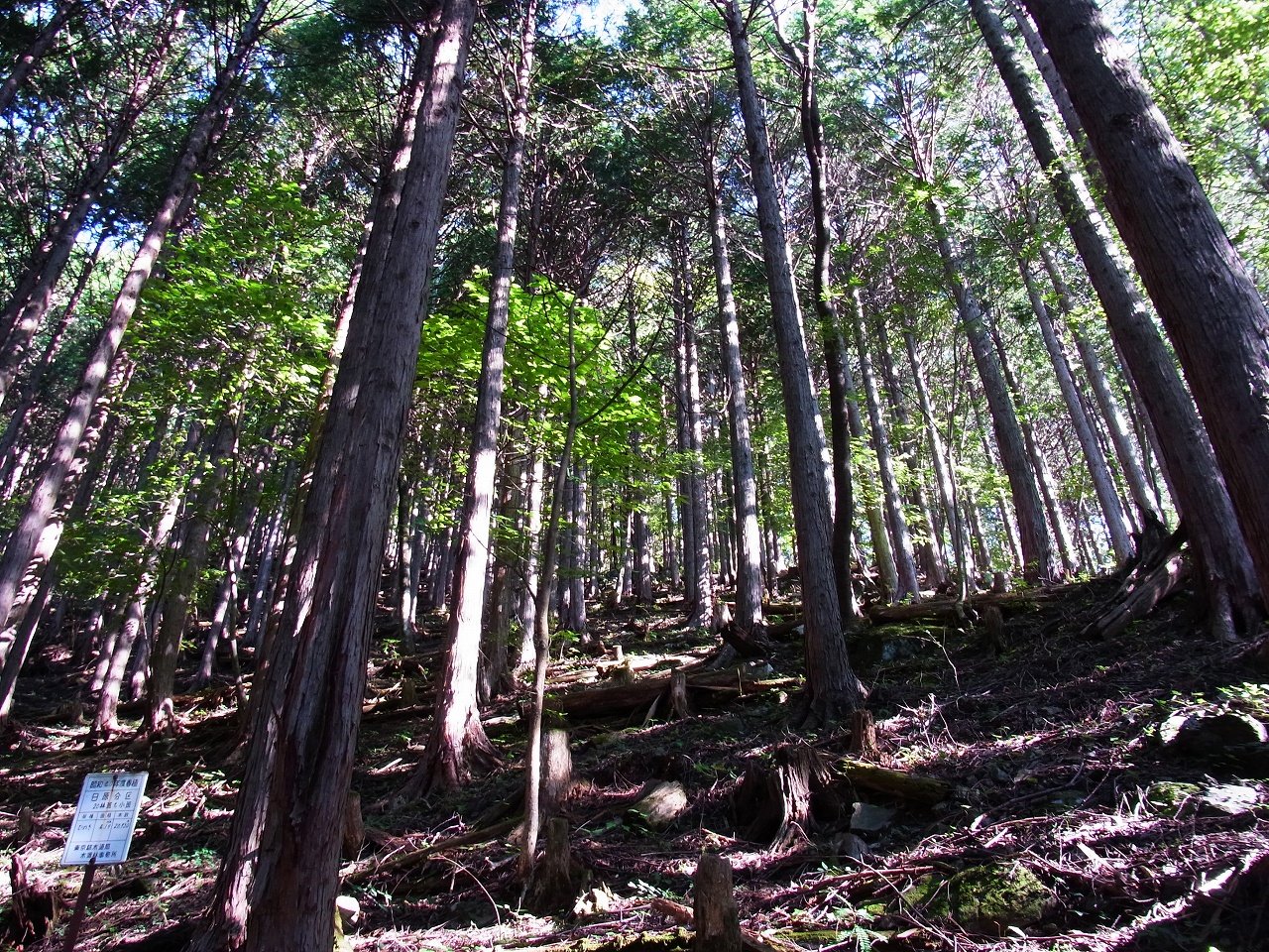 ここはバリエーションルートといっても一般登山道より快適な道、倒木は真ん中でぐっさり折れたヒノキが一本だけ。何も見えないし何の工夫もないひたすらの一本道を登るだけで、とくに楽しいこともありませんが、安全だし歩きやすくて文句ありません。上部は自然林になり紅葉(黄葉)はまだまだで、ここらは新緑の頃の訪問もよさそうですね。
