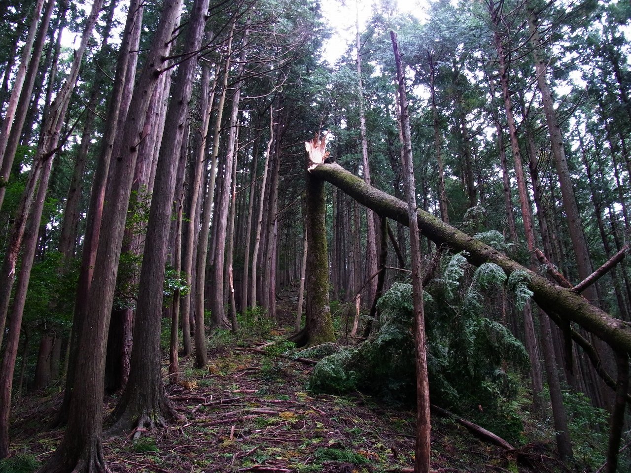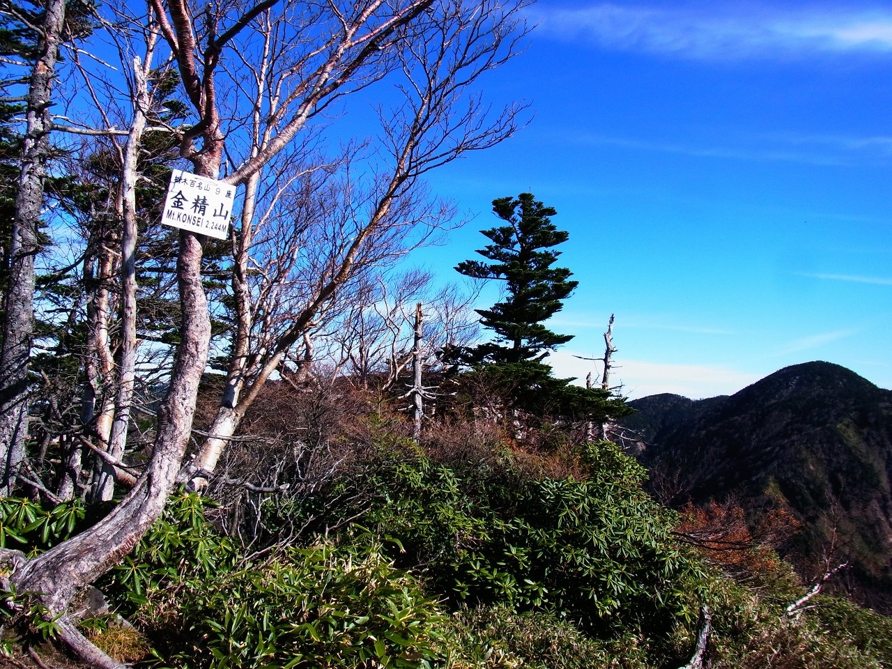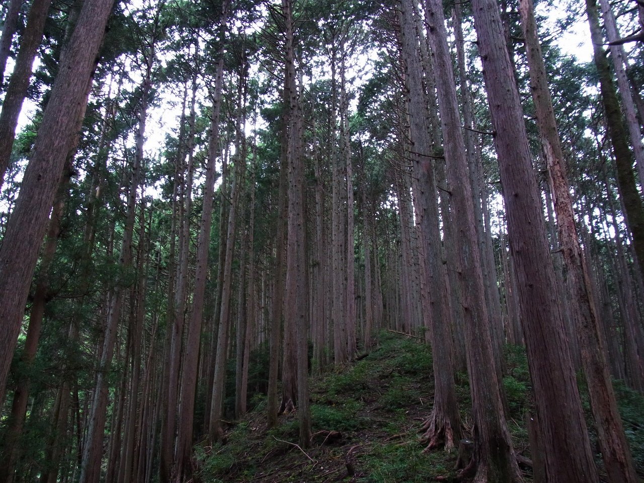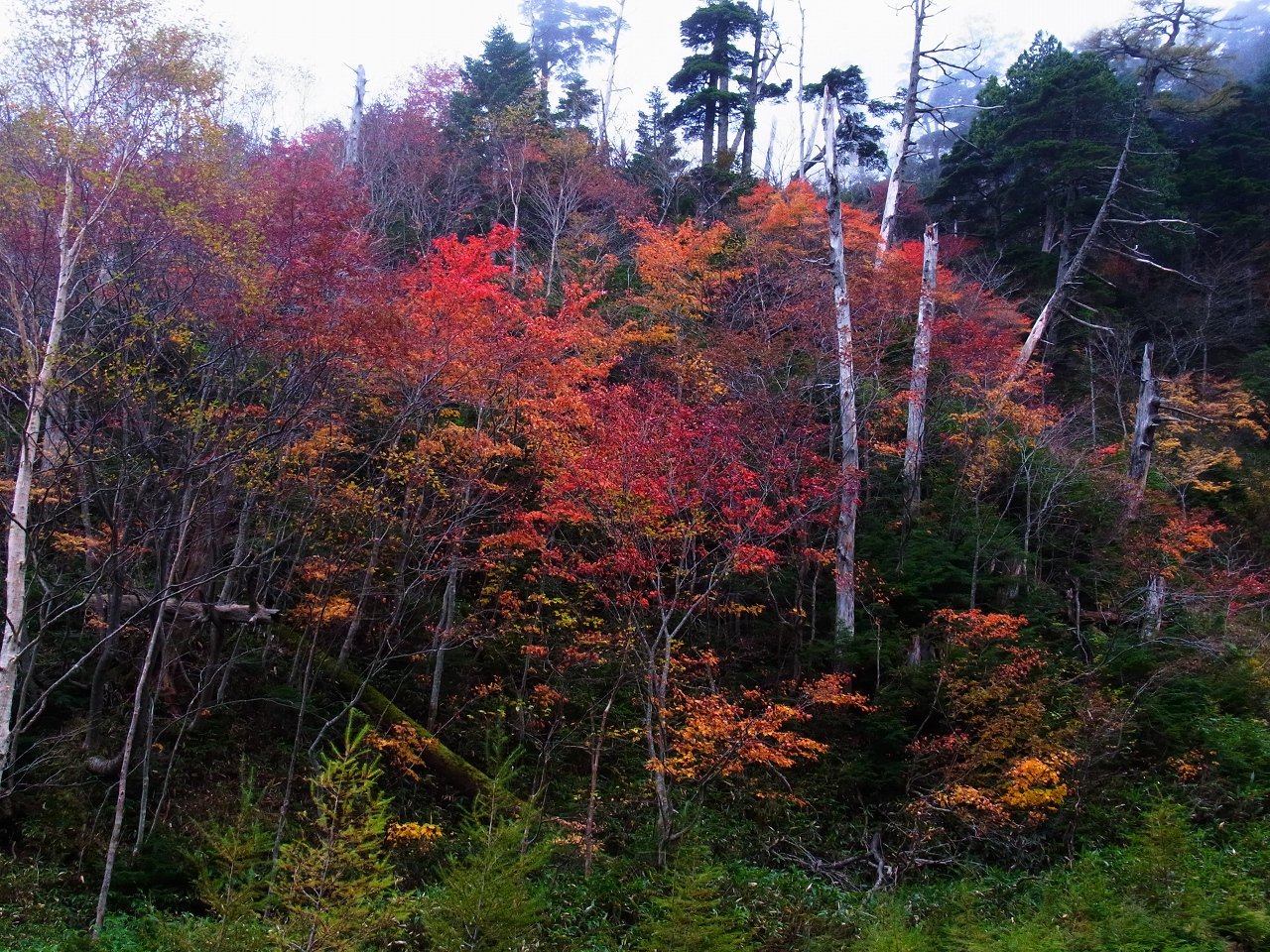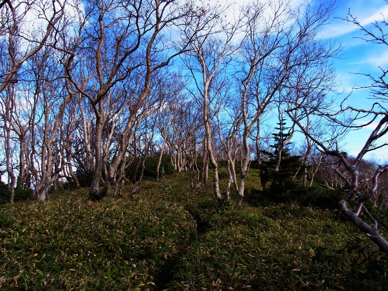 ここはバリエーションルートといっても一般登山道より快適な道、倒木は真ん中でぐっさり折れたヒノキが一本だけ。何も見えないし何の工夫もないひたすらの一本道を登るだけで、とくに楽しいこともありませんが、安全だし歩きやすくて文句ありません。上部は自然林になり紅葉(黄葉)はまだまだで、ここらは新緑の頃の訪問もよさそうですね。