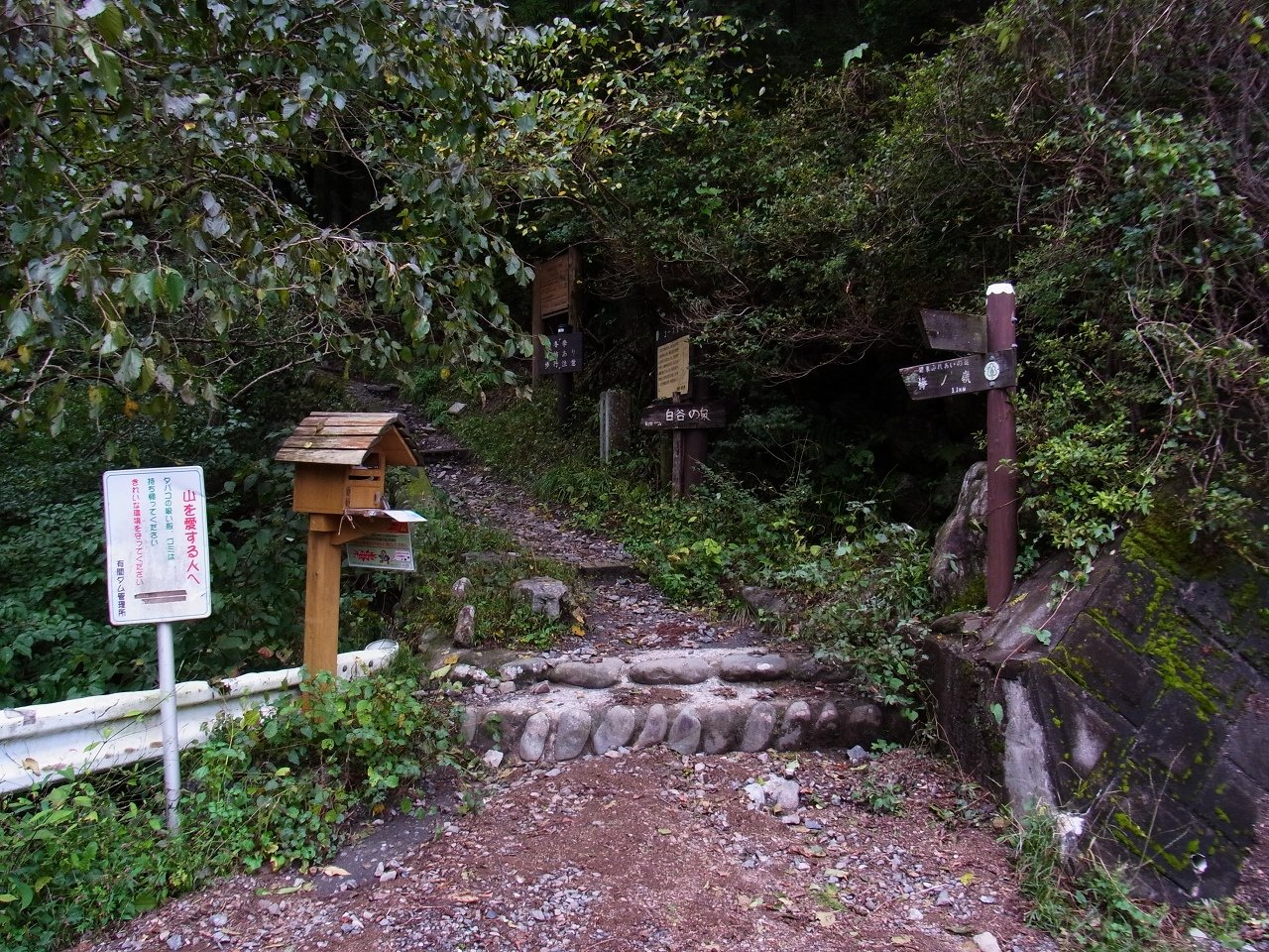 取水口へ凄い勢いで水が吸い込まれています。あそこに落ちたら絶対に助からないと思うと、見ているだけで恐ろしくなってきます。定番の白谷沢登山口は一見すると平穏そうですが、台風後の通った人のレコでは結構崩壊しているらしいです。さすがに探検じゃないんだから、沢筋の道は行かないですよ。回り込んで北東尾根に取り付きます。