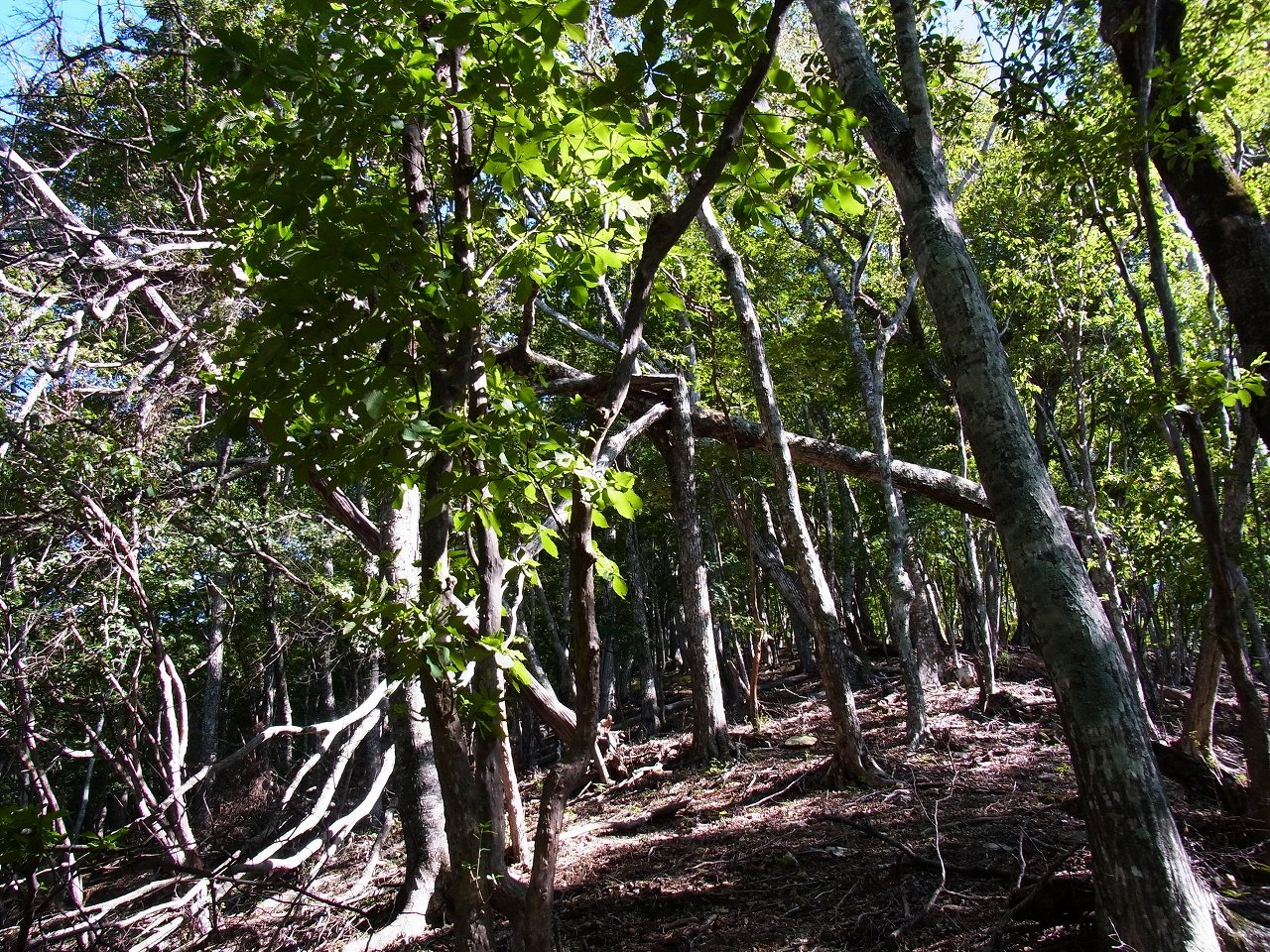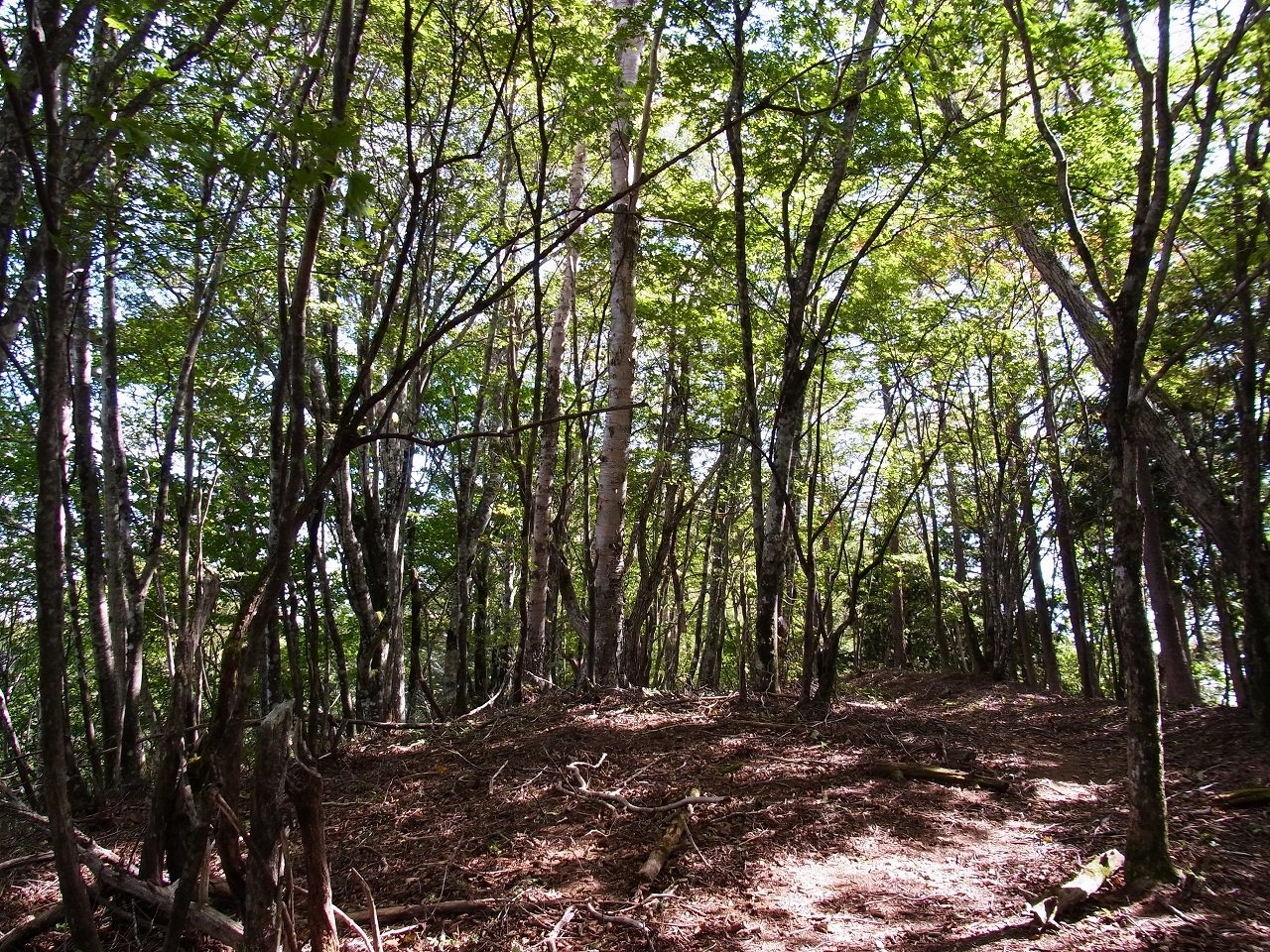 縦走路から離れ天目山山頂を目指します。この山頂直下は適度な幹回り自然林が適度な間隔で植わっており、新緑の頃は色鮮やかで好きな場所です。あっ山頂に着いた!誰もいない・・・。