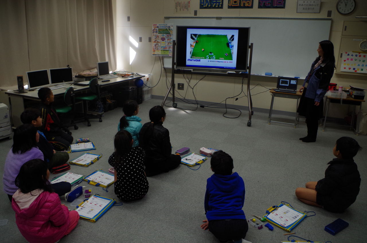 勉強の後は、ミニロボの大会の動画等でミニロボのイベントについて知って貰いました!
